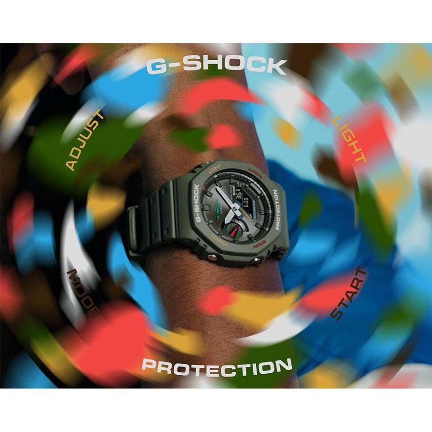 누가 여러분이 유쾌하면서 강인해질 수 없다고 말하나요? 다채로운 색상 포인트가 돋보이는 견고한 G-SHOCK을 소개합니다. 이제 파티와 놀이를 즐길 준비가 되었습니다. 이 시계는 GA-2100의 독특한 8각형 형태를 유지하고 스마트폰 연결 및 Tough Solar 충전과 같은 편리한 기능을 갖춘 GA-B2100을 기반으로 합니다. 또한 카본 코어 가드 구조 구조를 채택하여 오리지널 모델과 유사한 손목 착용감을 선사합니다. 좋아하는 패션과 쉽게 매치할 수 있는 검정색 흰색, 녹색과 같은 모노톤 색상이 밝은 빨간색, 파란색, 노란색, 녹색과 함께 베젤 인레이 섹션, 다이얼 부품, 인덱스 마크 및 9시 방향의 인셋 다이얼 표시기를 장식하고 있습니다. 덕택에 색종이 조각과 같은 색상 흐름이 미니멀한 디자인과 반짝이는 대비를 주면서 특별한 느낌을 선사합니다. 친구들과 어울리거나 야외 콘서트 또는 축제에서 댄스를 추는 등 유쾌한 일상 스타일을 표현할 수 있습니다.